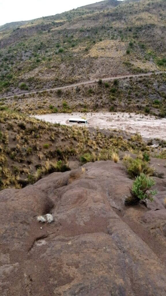 Un vehículo de transporte público fue arrastrado por la fuerte corriente de agua la noche de este jueves en la carretera Potosí–Uyuni, a la altura de Condoriri, kilómetro 30, luego de que las intensas lluvias incrementaran el caudal que cruza la vía. El hecho ocurrió aproximadamente a las 19:45, cuando el motorizado tipo Civilian intentó atravesar el sector y fue llevado por la fuerza del agua, según informó la Dirección Departamental de Bomberos Caracoles.